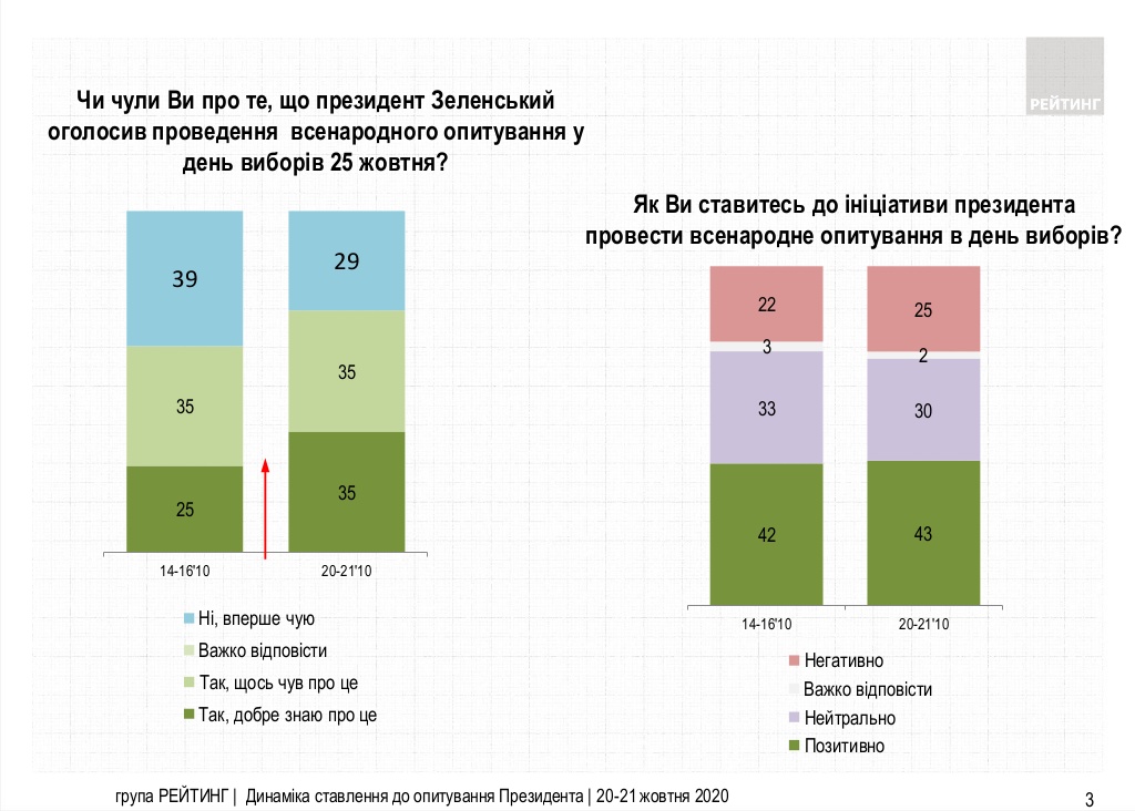 Про те, що президент Володимир Зеленський вирішив паралельно з місцевими виборами 25 жовтня провести “всеукраїнське опитування” знають 70% українців, йдеться у результатах опитування Соціологічної групи “Рейтинг”. З них 35% зазначили, що добре знають про опитування, а ще 35% - щось про нього чули. Взагалі нічого не знають про нього 29% опитаних.