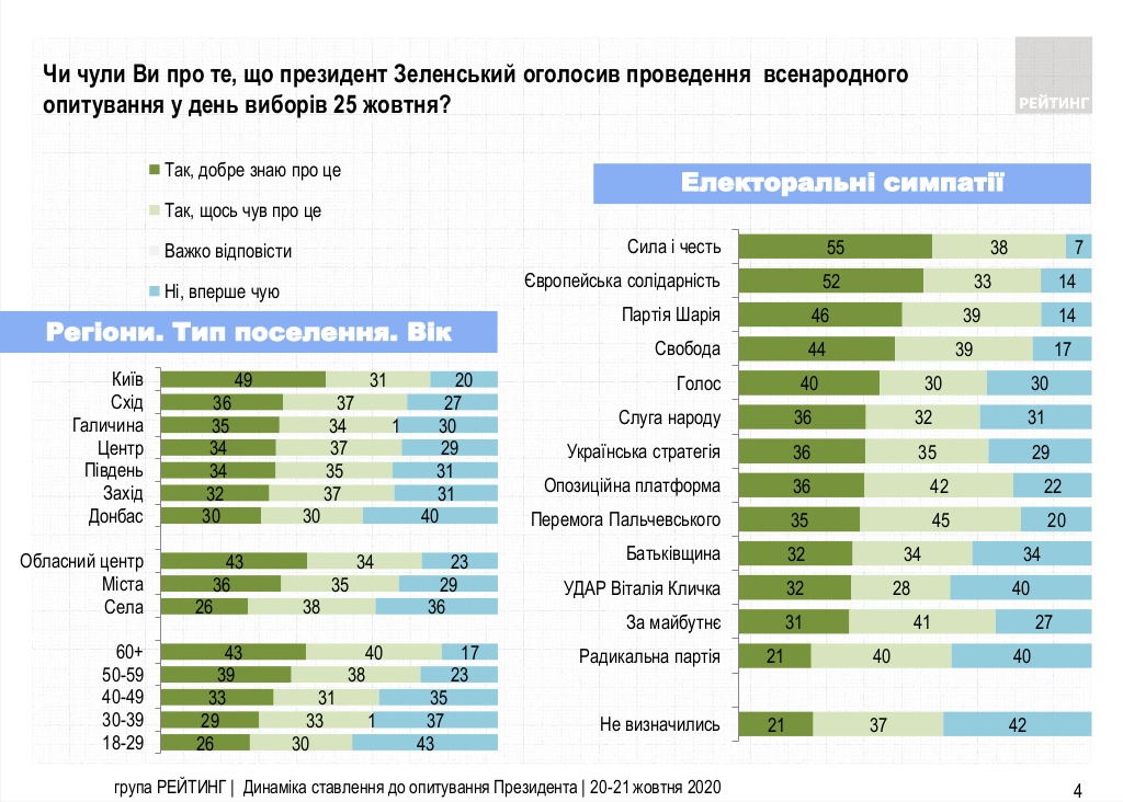 При цьому відносно вищий рівень обізнаності щодо ініціативи Зеленського фіксується серед мешканців обласних центрів та Києва, старшого населення, виборців партії “Сила і честь”, “Європейської солідарності”, партії Шарія та “Свободи”.