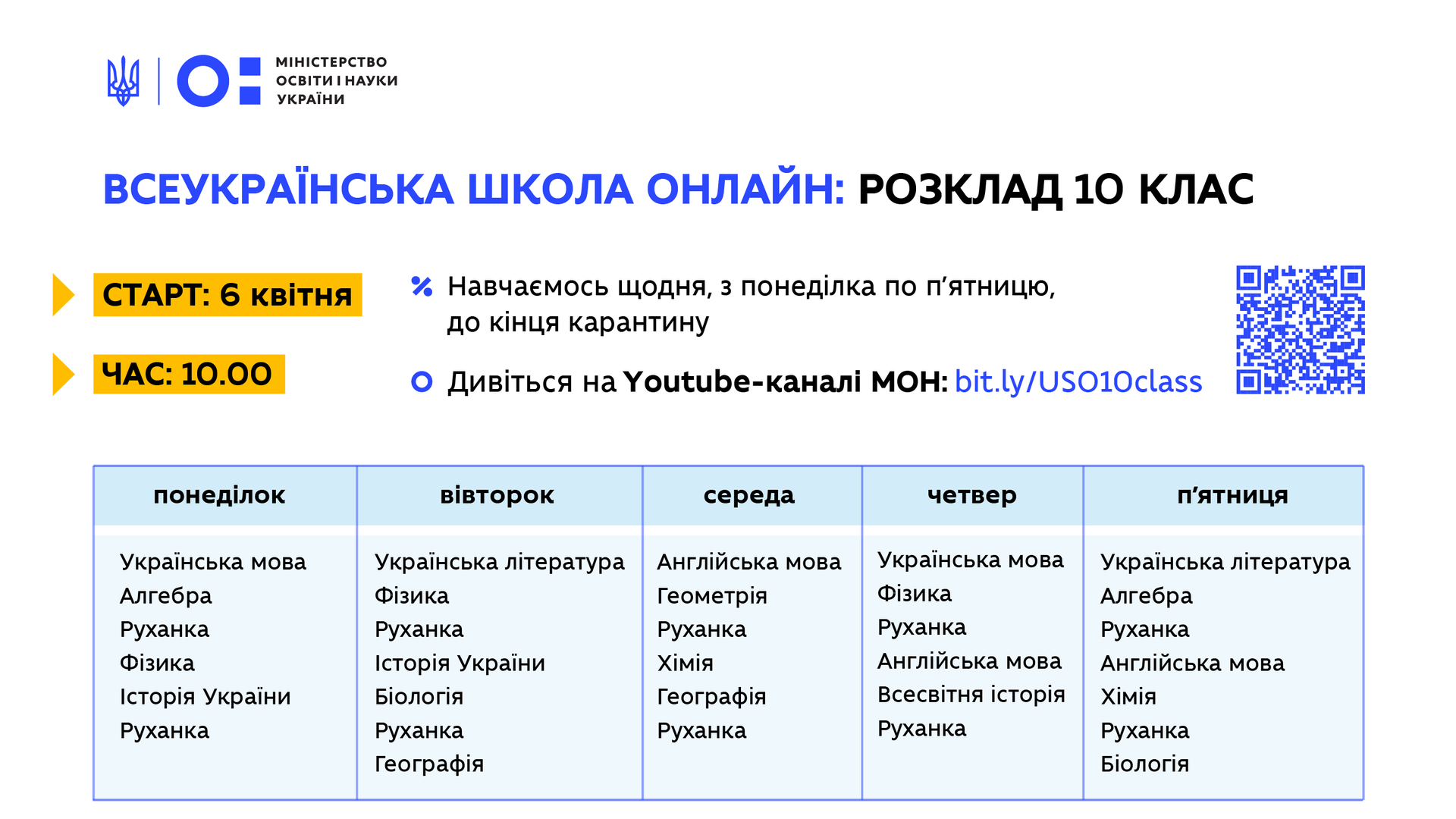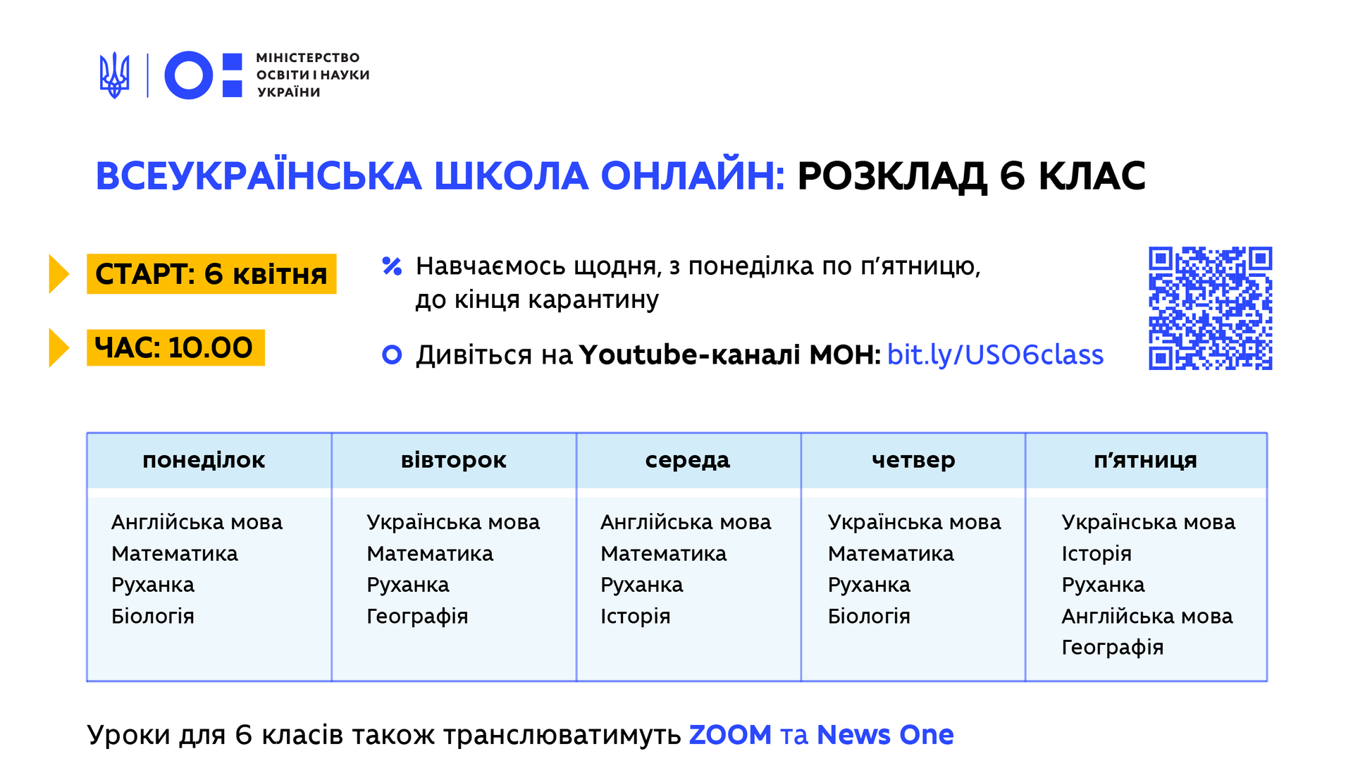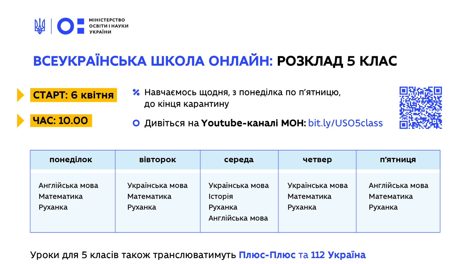 Зазначається, що уроки проходитимуть щодня, з понеділка по п'ятницю, до кінця карантину. Кожного дня вони починатимуться о 10:00.