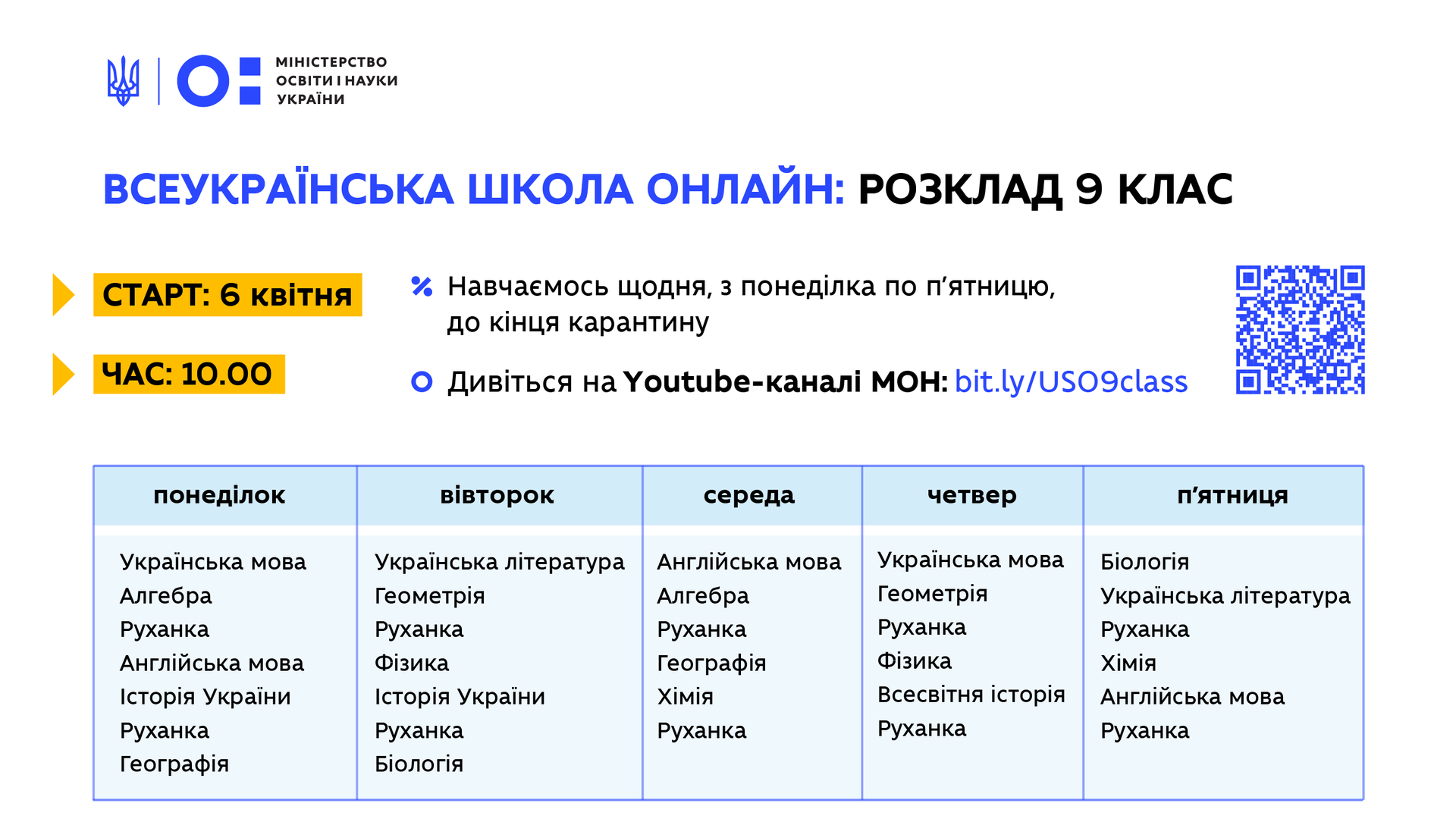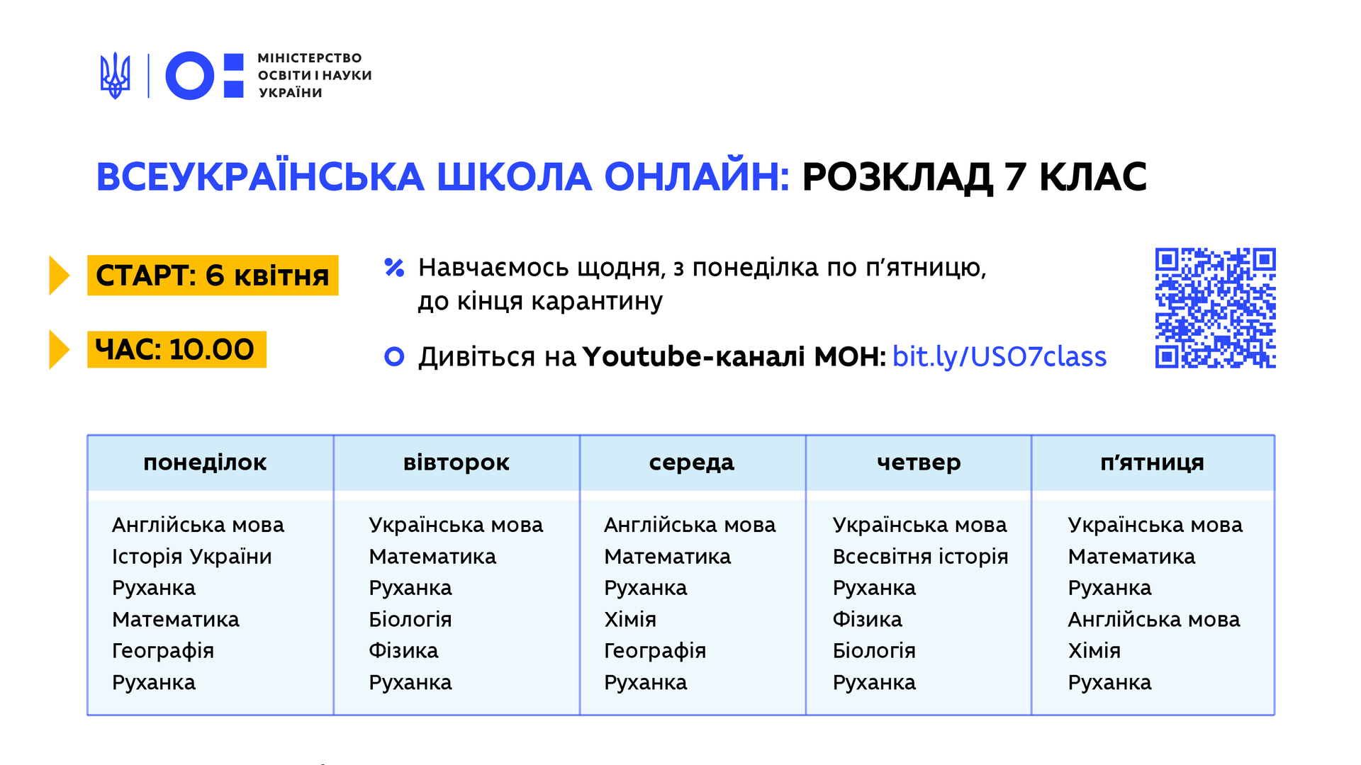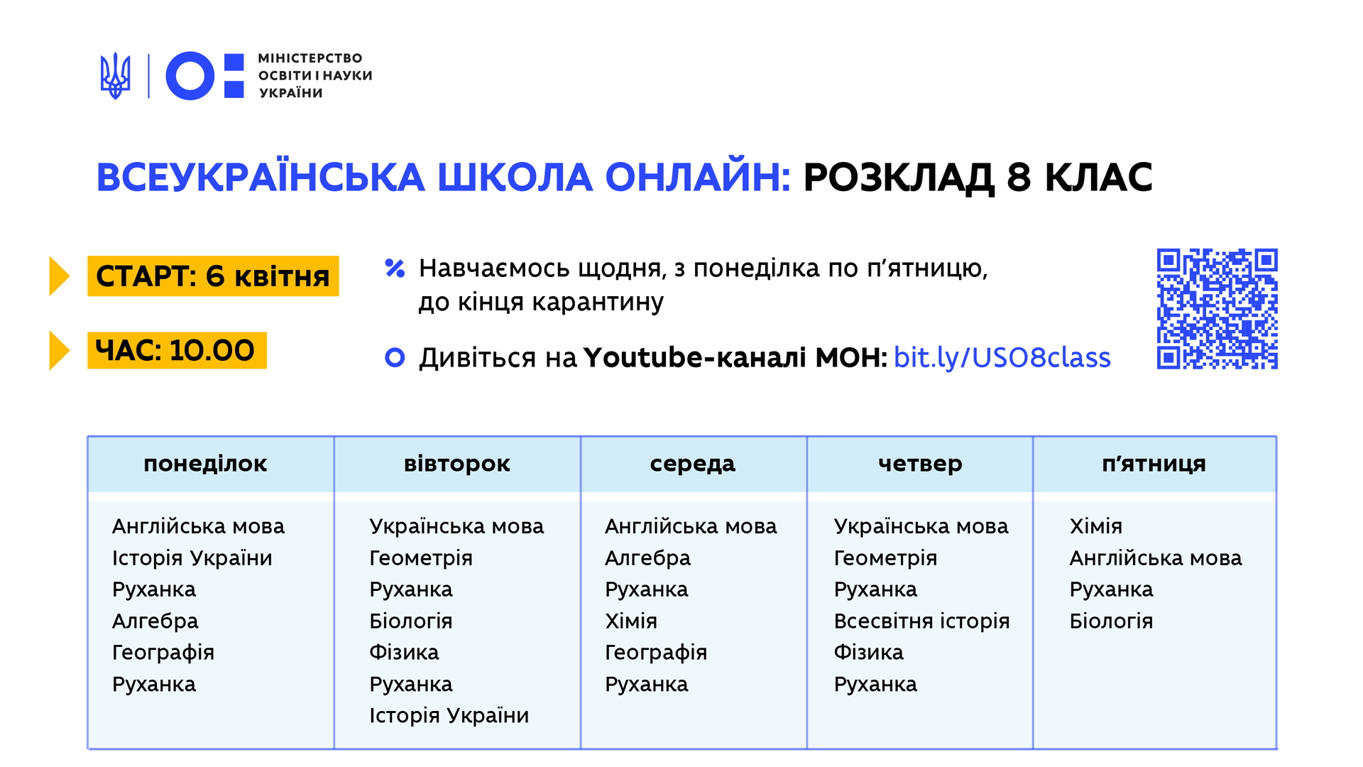 Зазначається, що уроки проходитимуть щодня, з понеділка по п'ятницю, до кінця карантину. Кожного дня вони починатимуться о 10:00.