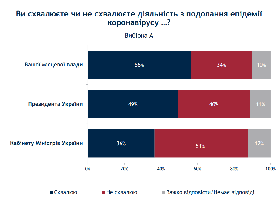 Щодо дій влади по боротьбі з епідемією COVID-19, найбільше українців висловили своє невдоволення роботою Кабінету міністрів. 51% опитаних українців заявили, що не схвалюють дії уряду (схвалюють - 36%). Дії місцевої влади не схвалюють 34% (схвалюють - 56%). Дії президента влади не схвалюють 40% (схвалюють - 49%).