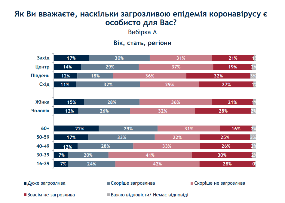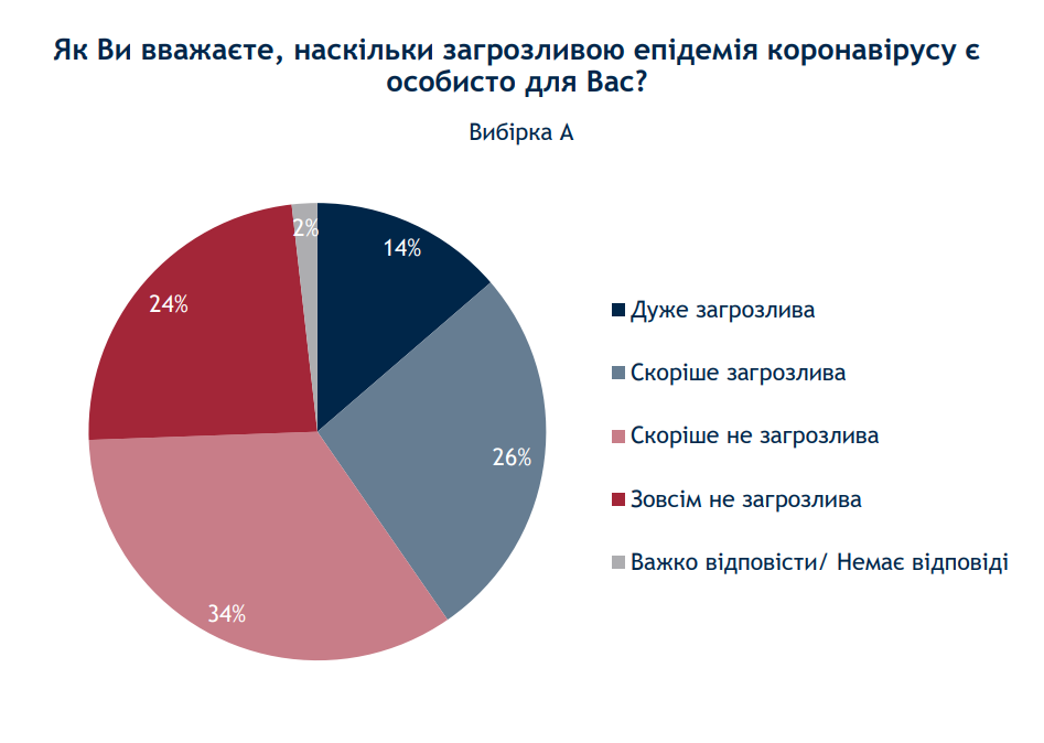 Станом на 30-31 липня 40% українців вважали епідемію коронавірусу загрозою. Серед них 14% дотримувалися думки, що COVID-19 дуже небезпечний. 24% опитаних українців заявили, що коронавірус зовсім не становить загрози для них особисто. Про це свідчать дані опитування Соціологічної групи "Рейтинг".