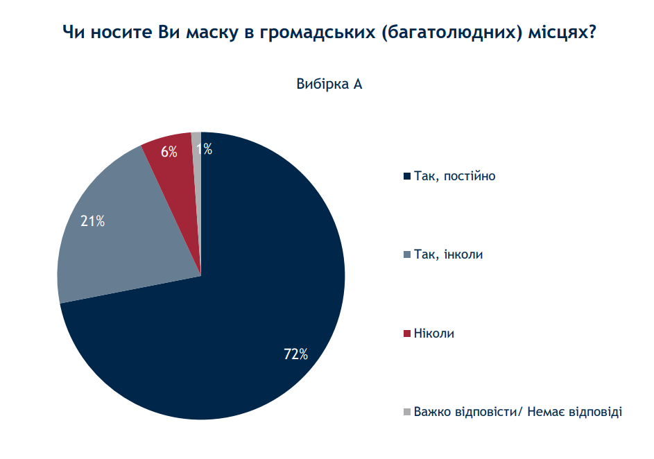 Разом з тим, 72% опитаних відповіли, що постійно носять в громадських місцях маску. ще 21% іноді надягає маску. Всього 6% нею не користуються.