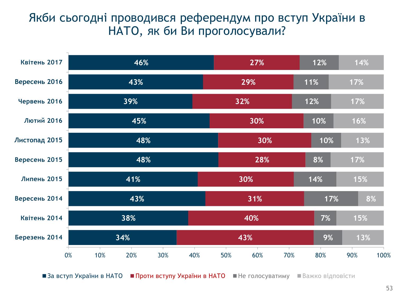 З усіх опитаних 46% підтримують вступ до НАТО, 27% виступають проти, 12% не будуть голосувати, 14% не визначилися.