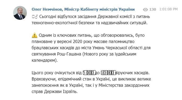 "Сьогодні відбулося засідання Державної комісії з питань техногенно-екологічної безпеки та надзвичайних ситуацій. Одним з ключових питань, які обговорювалися, було плановане у вересні 2020 року масове паломництво брацлавських хасидів в місто Умань Черкаської області для святкування Рош-ха-Шана (Нового року за іудейським календарем)", - написав Немчинов.