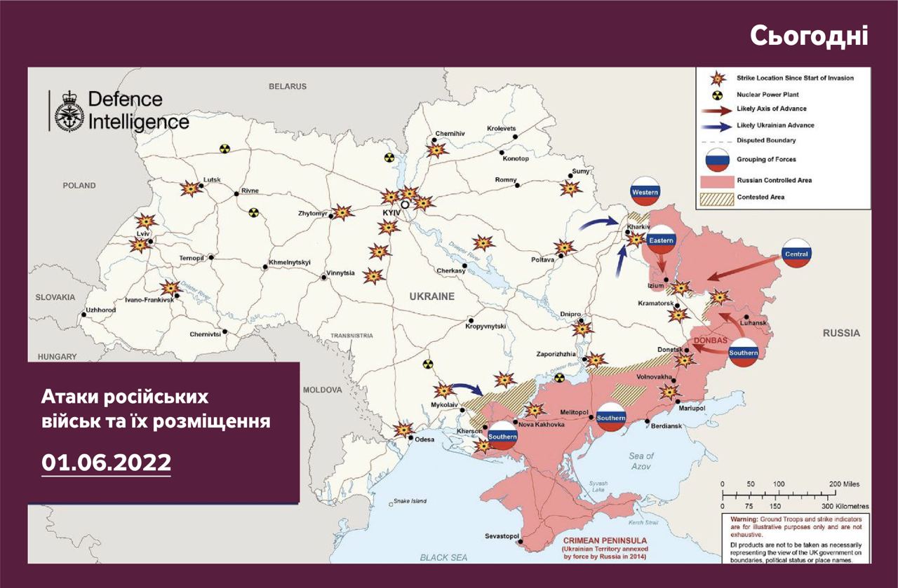 Міноборони Британії опублікувало актуальну карту бойових дій в Україні станом на середу, 1 червня.