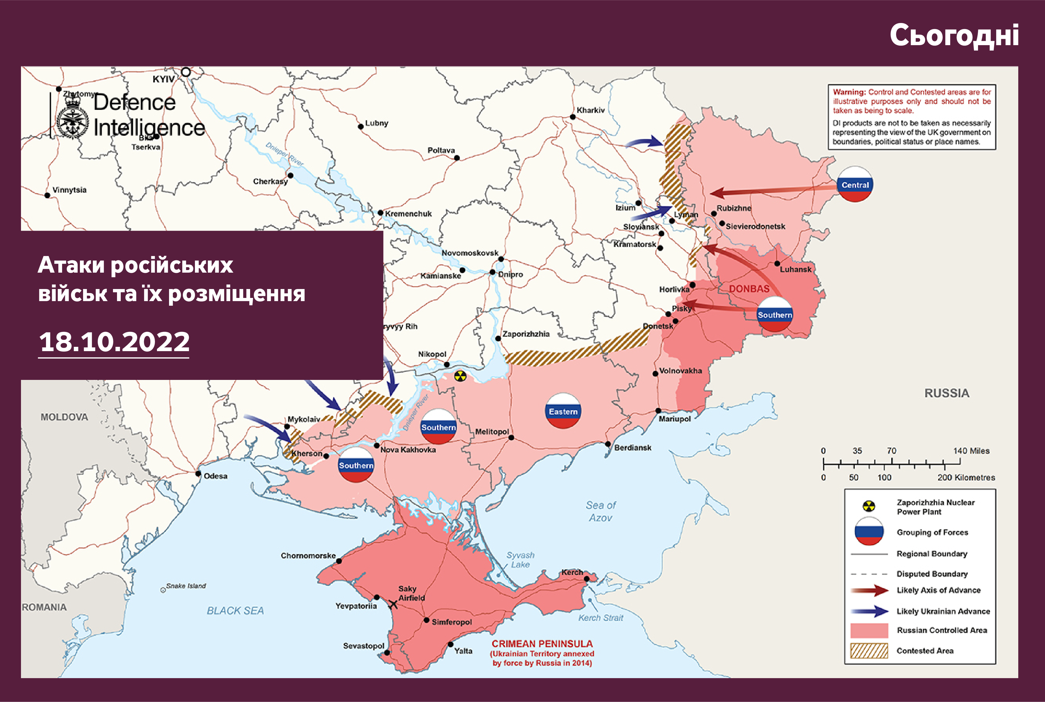 Міністерство оборони Британії опублікувало актуальну карту бойових дій в Україні станом на вівторок, 18 жовтня.