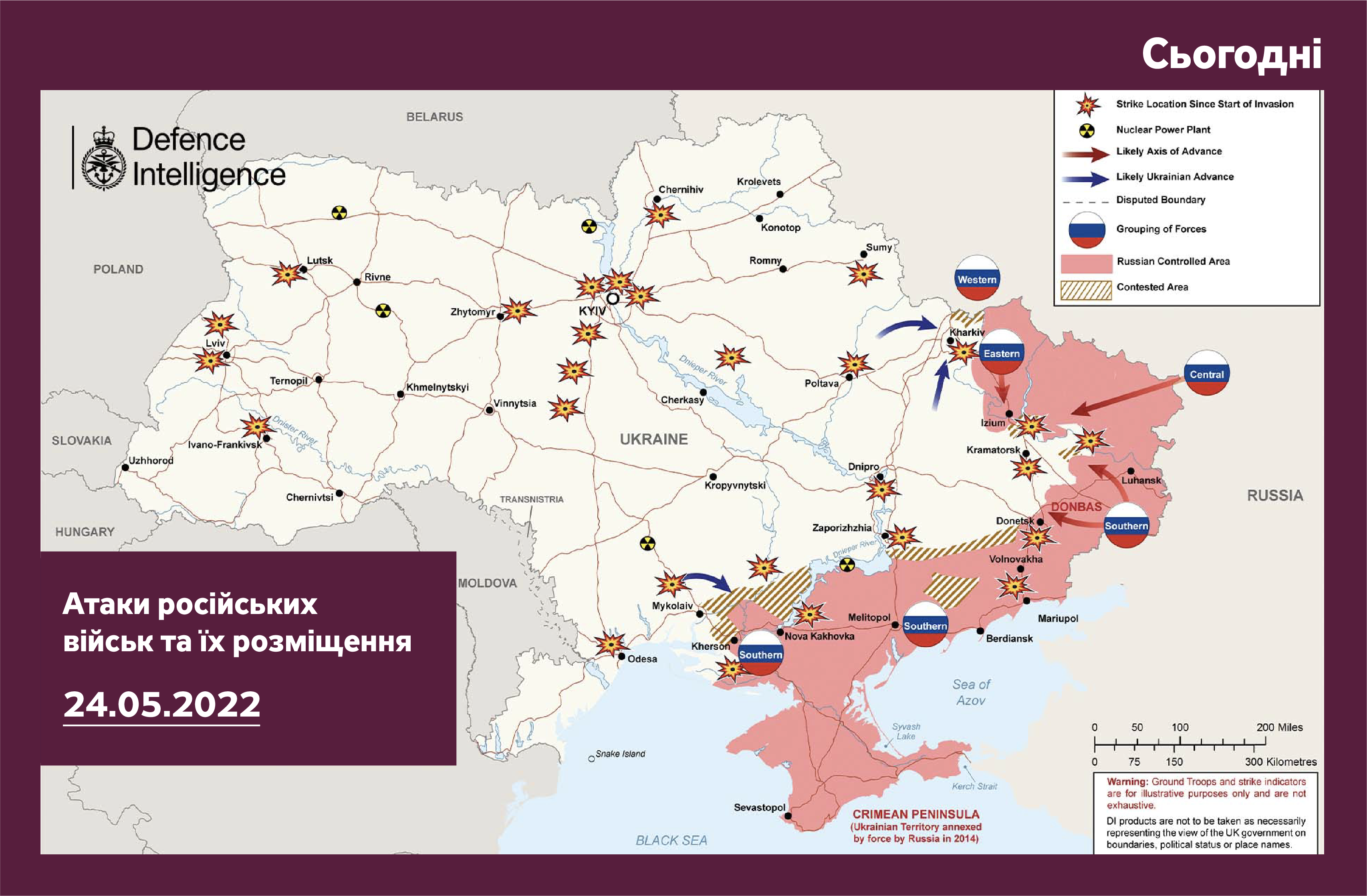 Міноборони Британії опублікувало актуальну карту бойових дій в Україні станом на вівторок, 24 травня.