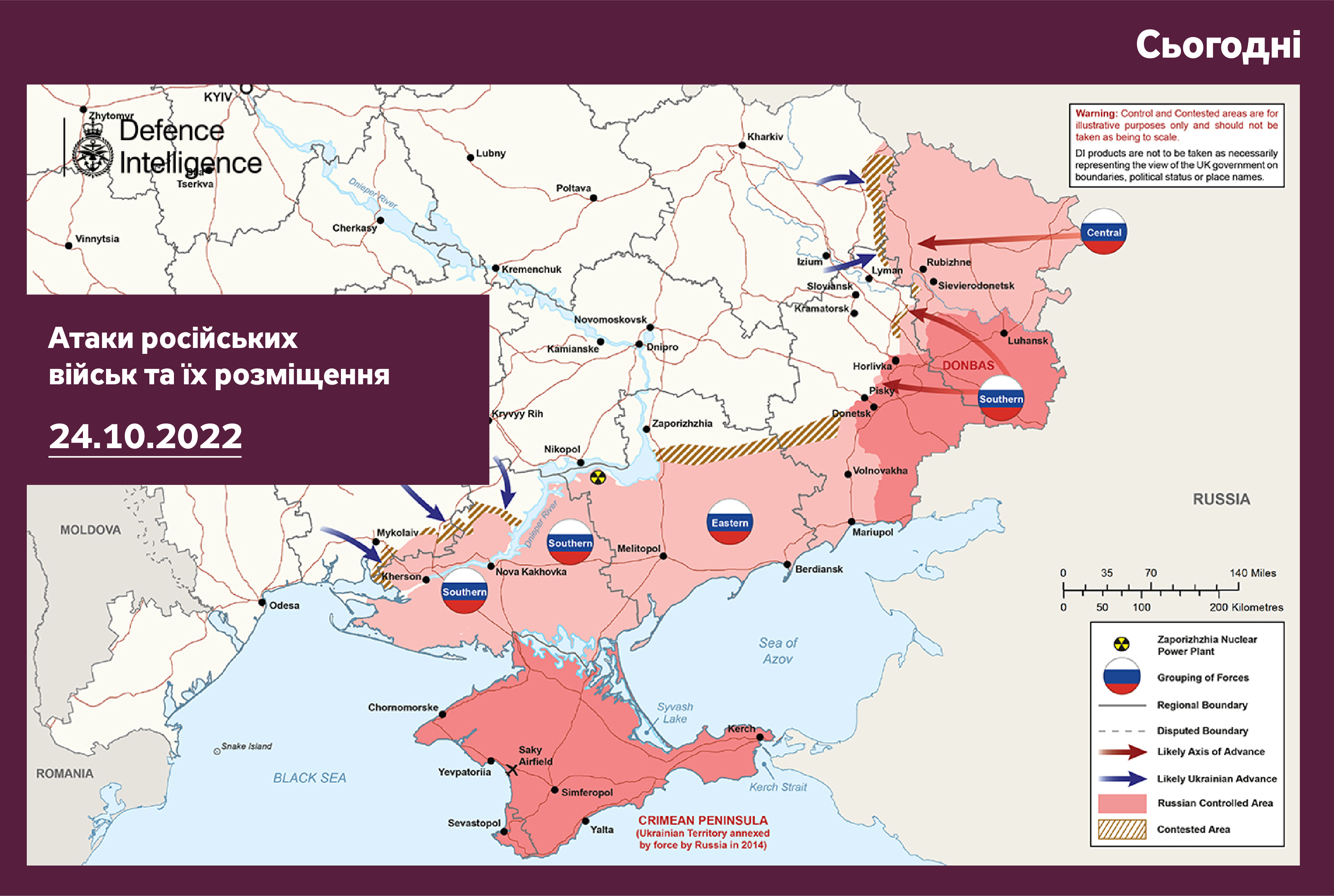 Міністерство оборони Британії опублікувало актуальну карту бойових дій в Україні станом на понеділок, 24 жовтня.