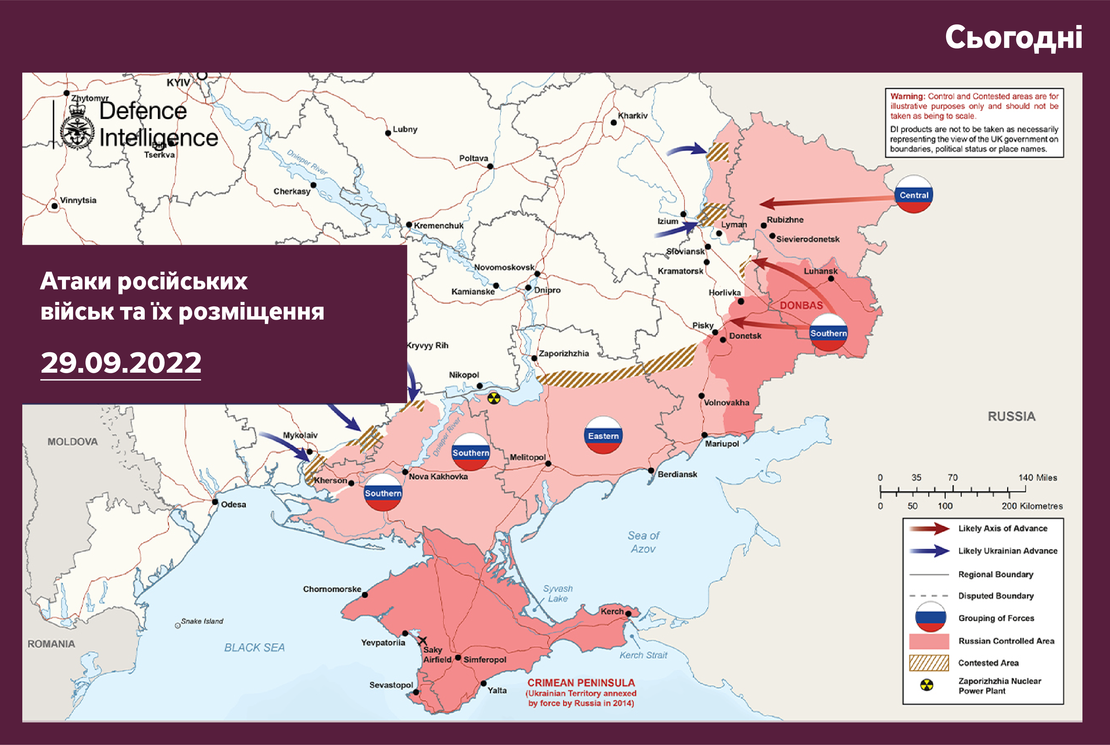Міністерство оборони Британії опублікувало актуальну карту бойових дій в Україні станом на четвер, 29 вересня.