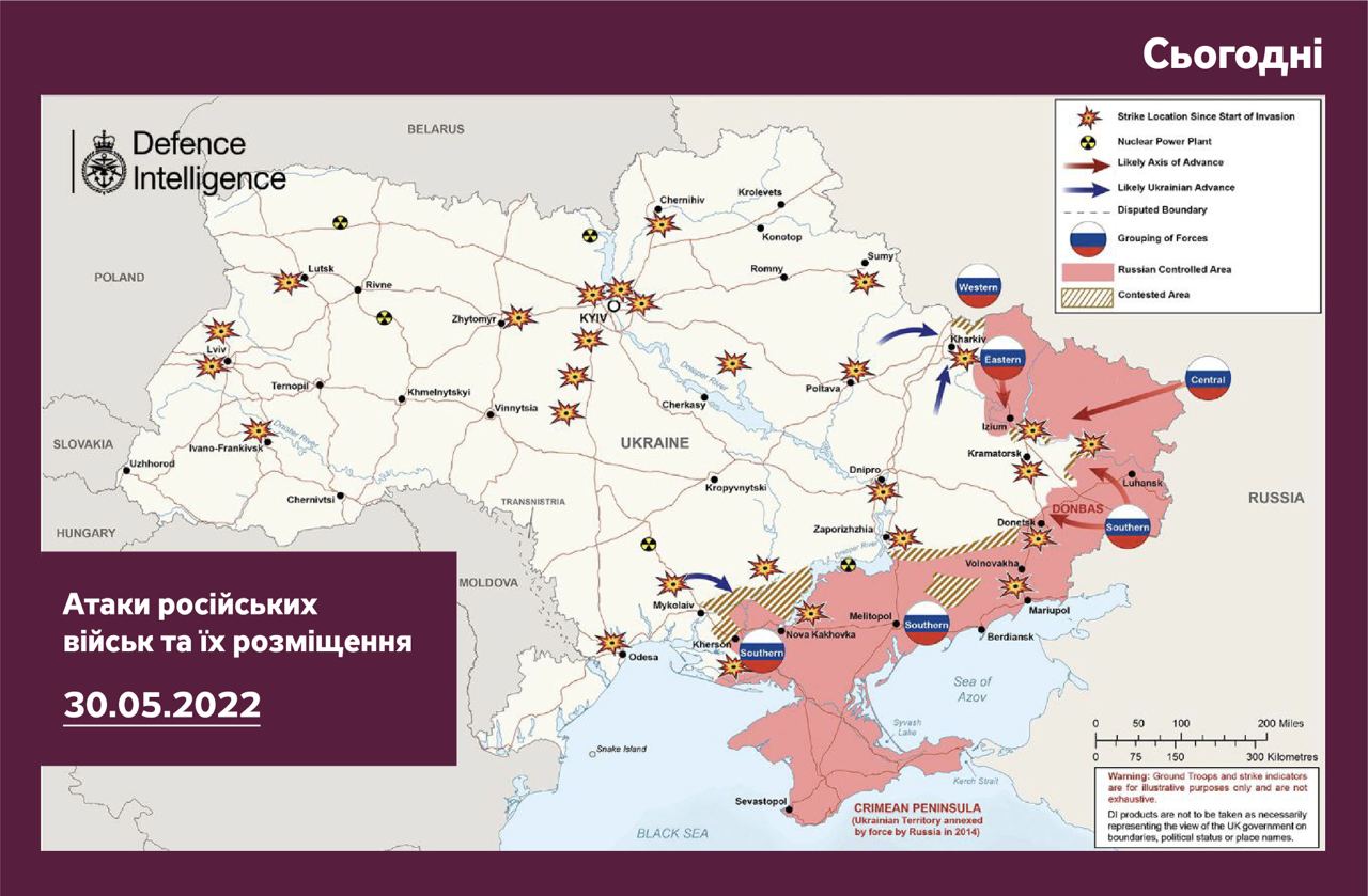 Міноборони Британії опублікувало актуальну карту бойових дій в Україні станом на понеділок, 30 травня.