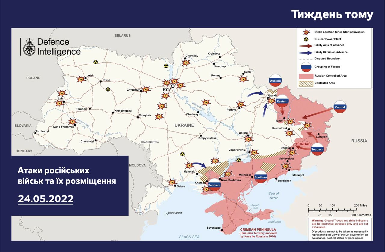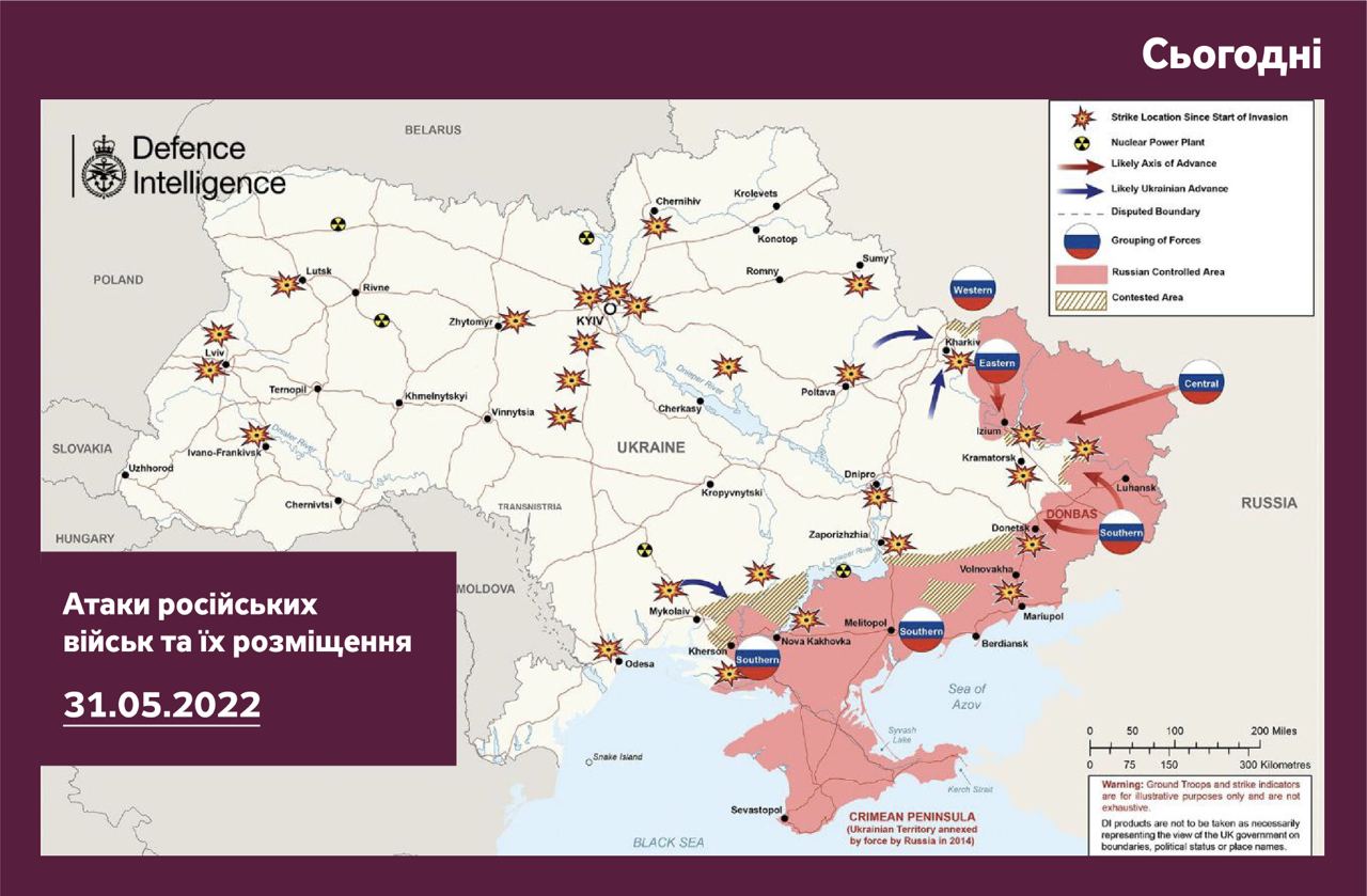 Міністерство оборони Британії опублікувало актуальну карту бойових дій в Україні станом на вівторок, 31 травня.