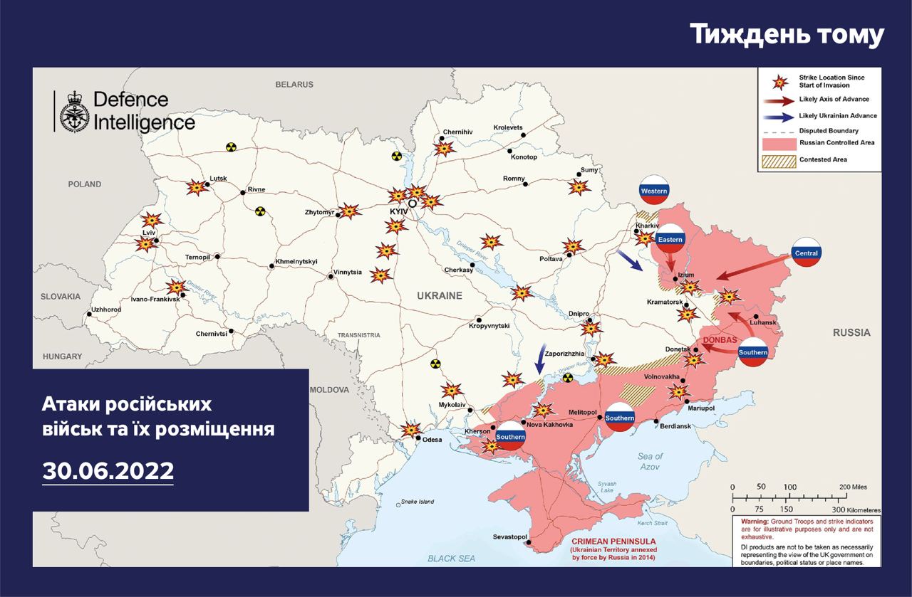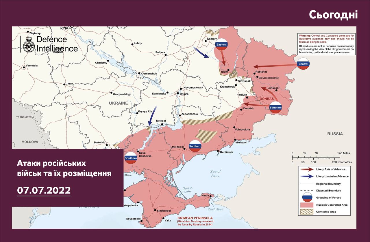 Міністерство оборони Британії опублікувало актуальну карту бойових дій в Україні станом на четвер, 7 липня.
