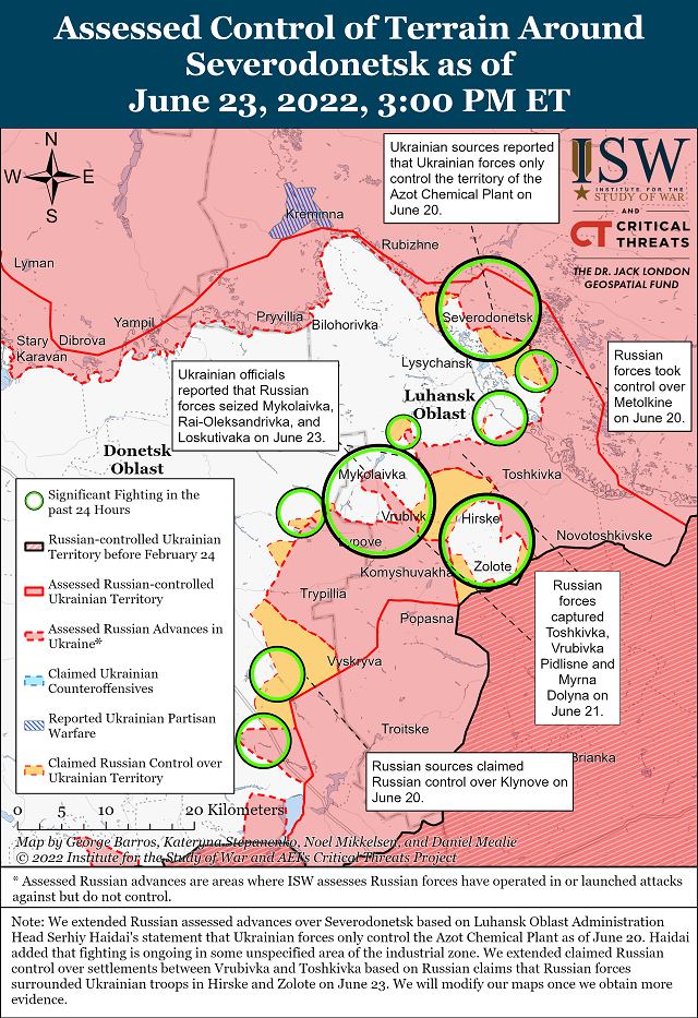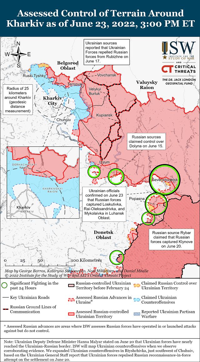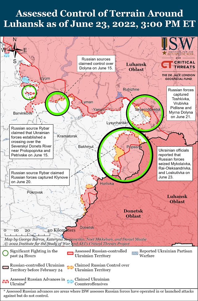 «Українським військам протягом кількох тижнів вдавалося втягувати в цей район значну кількість російського персоналу, зброї та техніки, що, ймовірно, знижувало загальні можливості російських сил, не дозволяючи їм зосередитись на більш вигідних напрямках наступу. Найближчими тижнями російські наступальні операції, ймовірно, призупиняться незалежно від того, чи захоплять російські сили район Сєверодонецька-Лисичанська чи ні, що, ймовірно, дасть українським силам можливість розпочати обережні контрнаступи», – йдеться у зведенні ISW.