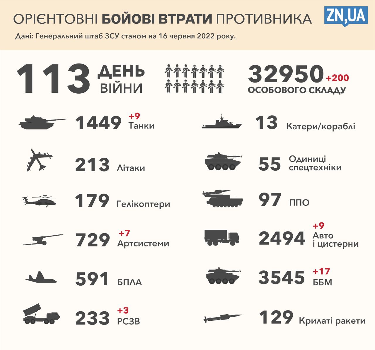Загальні бойові втрати противника з 24.02 по 16.06 орієнтовно склали:
