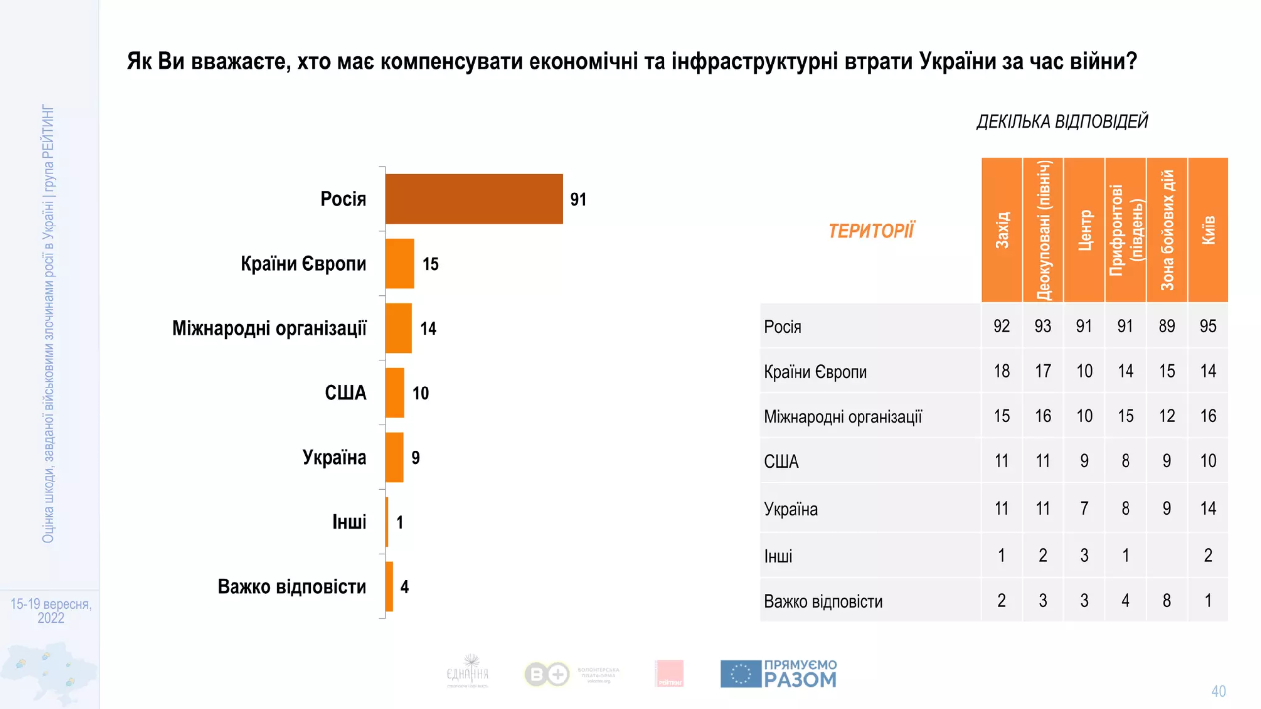 Водночас компенсацій від країн Європи та міжнародних організацій очікують 14-15%, від США – 10%, від України – 9%. Вірять в можливість її реалізації від цих країн більше 70%.