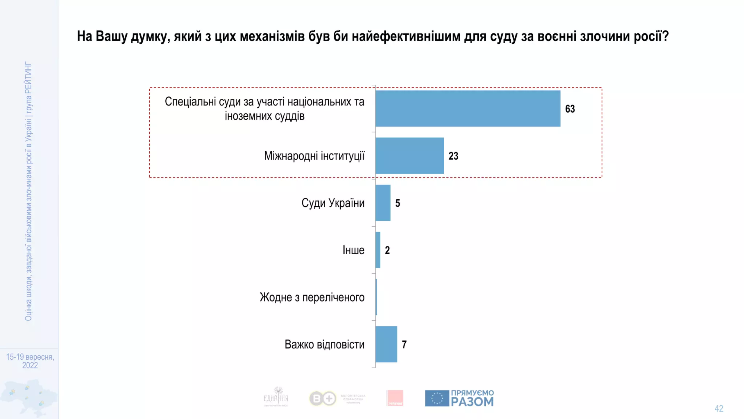 При цьому найефективнішим механізмом покарання Росії за воєнні злочини українці вважають спеціальні суди за участі національних та іноземних суддів (63%) та міжнародні інституції (23%).