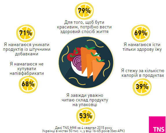 Популярний тренд здорового способу життя не обійшов Україну стороною. Переважна більшість (79%) опитаних упевнені, що для того щоб бути красивим, потрібно вести здоровий спосіб життя. 71% прагне уникати продуктів з штучними добавками, а трохи менше, 69% намагаються їсти тільки здорову їжу і 68% не купувати напівфабрикатів.