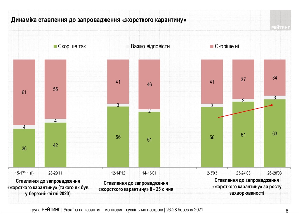 Запровадження жорсткого карантину у випадку збільшення захворюваності на коронавірус підтримують 68% українців, йдеться в опитуванні Соціологічної групи “Рейтинг”. Протилежної думки притримуються 34% опитаних. Соціологи зазначили, що з початку березня спостерігається зростання підтримки жорсткого карантину.