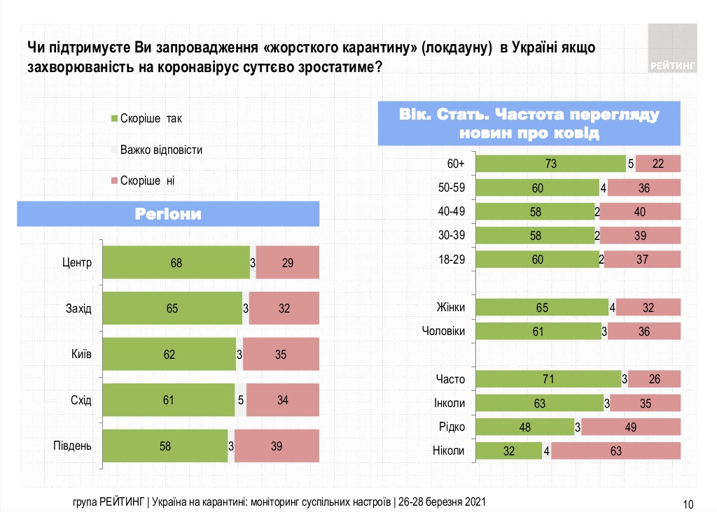 Найбільше підтримують жорсткий карантин і вірять, що він зменшить захворюваність респонденти старшого віку, жінки, а також ті, хто часто слідкують за новинами про коронавірус.