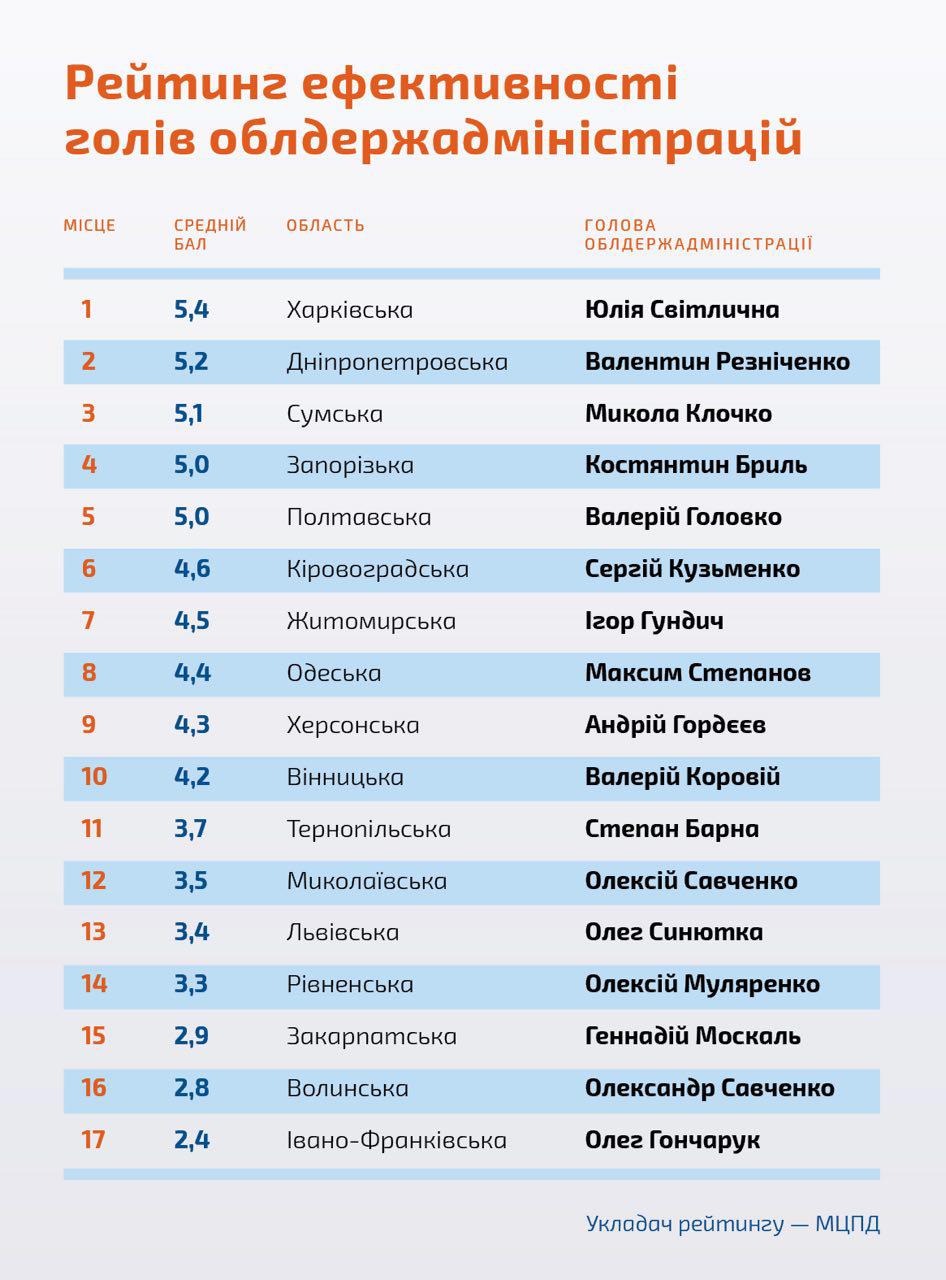 За даними експертів, найбільш ефективними виявилися голова Харківської ОДА Юлія Світлична та голова Дніпропетровської ОДА Валентин Резніченко.