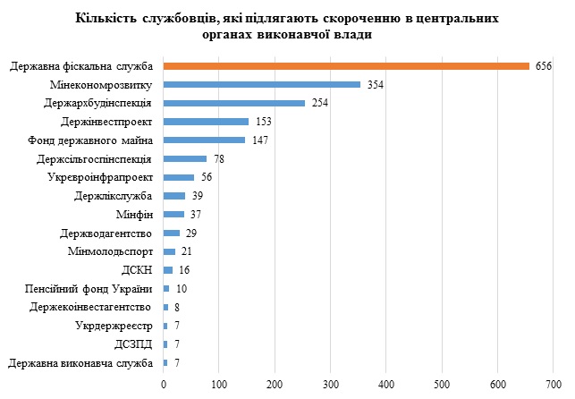 Найбільша кількість скорочень очікується в Державній фіскальній службі (ДФС). У центральному апараті планують звільнити 656 осіб.