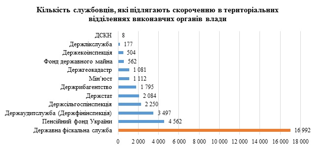 За підрахунками експертів Бюро ГромЕкс, в центральному апараті виконавчих органів влади під скорочення підпадуть всього 137 посадових осіб, тоді як у територіальних представництвах звільнять понад 34 тисяч працівників держустанов.