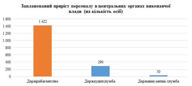 Крім скорочень уряд передбачив також і збільшення штату деяких держустанов. Так, у центральному апараті очікується загальне збільшення чисельності персоналу на 1742 людини, серед яких 1422 – це працівники Держрибагентства, які в рамках реформи рибного господарства, будуть боротися з браконьєрами і сприяти збереженню рибного фонду. Ще 290 службовців будуть працювати у новоствореній Держаудітслужбі (колишня Держфінінспекція) і додатковими 30 співробітниками поповняться ряди Державної митної служби.