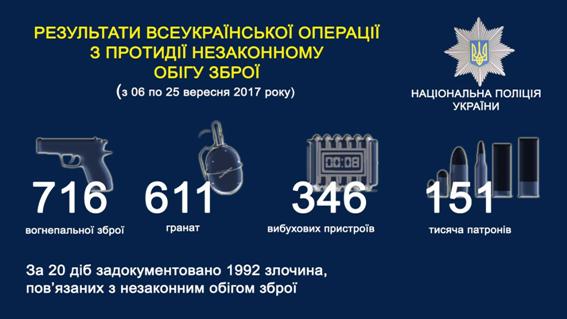 В Україні протягом 20 діб відкрито маже дві тисячі (1992) кримінальних проваджень за фактом незаконного обігу вогнепальної зброї та вибухівки. З цих правопорушень розкрито кожне п'яте (410 штук), повідомив перший заступник голови Національної поліції України В'ячеслав Аброськін.