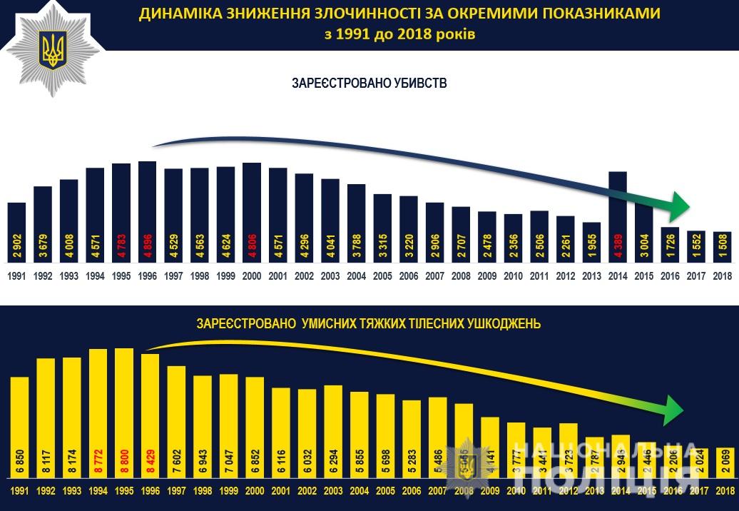 Голова відомства також спростував думку, що в Україну повернулися "лихі 90-ті", так як кількість умисних вбивств скорочується. Так, у 2018 році було скоєно 1,5 тисячі таких вбивств, що є найменшим показником за всі роки незалежності. Князєв нагадав, що з 1993 по 2003 рік щорічно реєструвалося більше чотирьох тисяч таких вбивств.