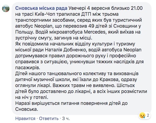 "Важких травм не виявлено. Шістьох дітей було доставлено до лікарні, а всіх інших розмістили на ніч у готелі. Наразі вирішується питання повернення дітей до Сновська", - сказано у повідомленні.