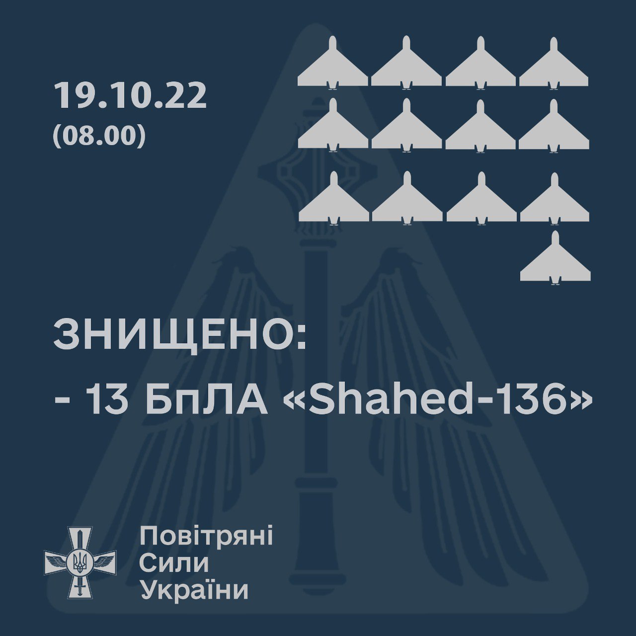 В ніч з 18 на 19 жовтня наші захисники знищили на Миколаївщині 13 дронів-камікадзе іранського виробництва. Про це повідомили Повітряні Сили ЗСУ.