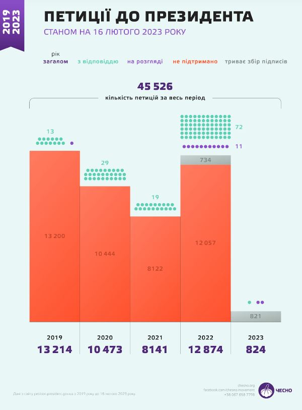 Так, у 2021 році громадяни зареєстрували 8 141 петицію, а вже минулого року – 12 874. При цьому позаторік президент підтримав 19 петицій, а в 2022 році – 83.