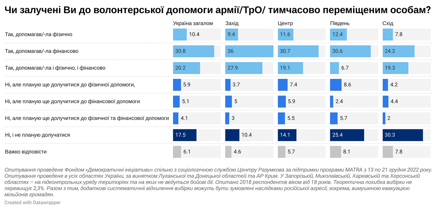 Водночас 61% громадян так чи інакше долучилися до волонтерської допомоги Силам оборони чи своїм співгромадянам. Зокрема, близько 10% допомагали фізичною роботою, 31% – фінансово, близько 20% – фінансово та роботою.