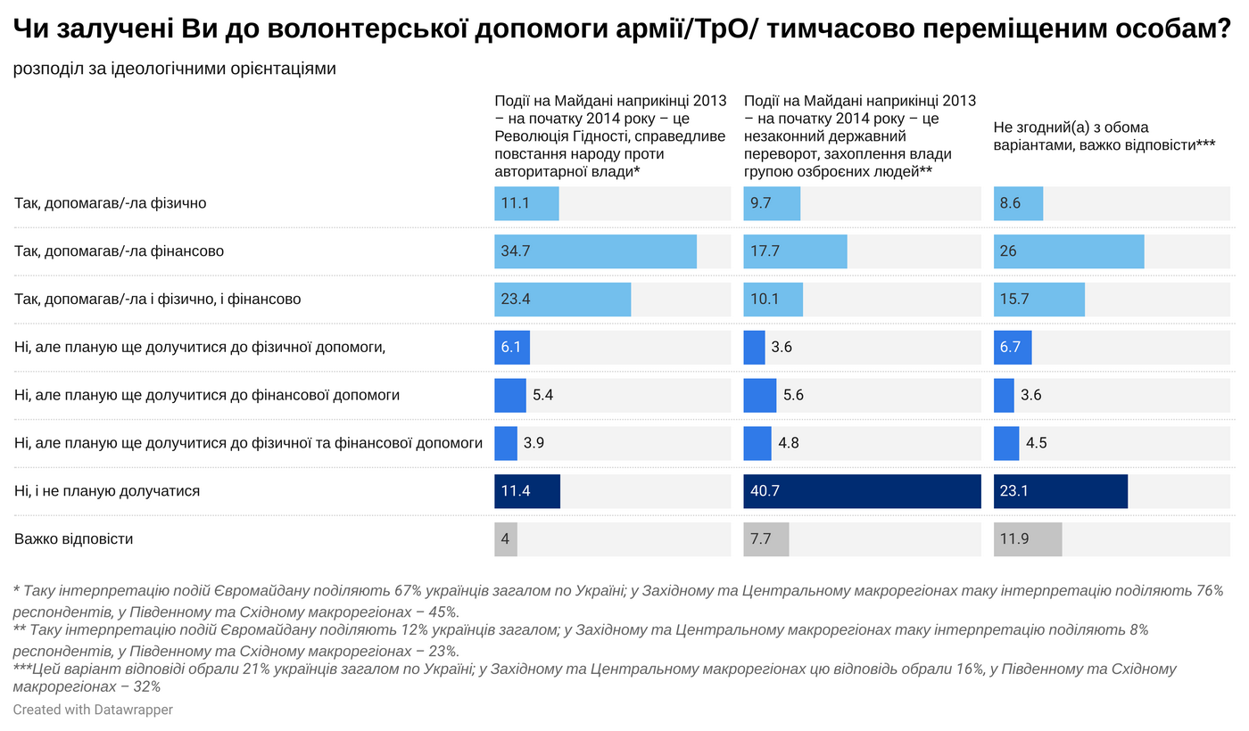 У результатах дослідження вказано, що суттєво менша долученість до волонтерства та прагнення надавати допомогу своїй армії та співгромадянам спостерігається серед людей, на погляди яких вплинула російська пропаганда. Зокрема, серед тих, хто погоджується з російською інтерпретацією Революції Гідності як «державного перевороту», більше тих, хто не воліє допомагати Силам оборони України чи ВПО. Соціологи нагадали, що загалом в Україні цей пропагандистський наратив досі підтримують близько 12%. При цьому серед мешканців Півдня та Сходу України погоджуються з цим близько 23%, але й там вони не становлять більшості.