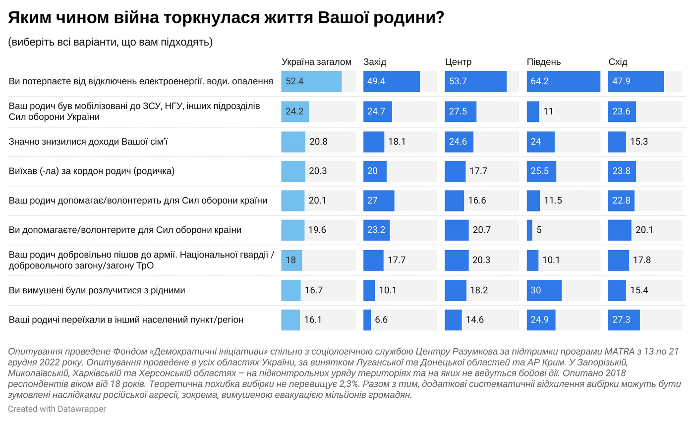 Дослідження провели Фондом «Демократичні ініціативи» імені Ілька Кучеріва спільно з соціологічною службою Центру Разумкова за підтримки програми MATRA з 13 по 21 грудня 2022 року. 2018повнолітніх респондентів опитали методом face-to-face проводилося у: Волинській, Закарпатській, Івано-Франківській, Львівській, Рівненській, Тернопільській, Чернівецькій областях (Західний макрорегіон); Вінницькій, Житомирській, Київській, Кіровоградській, Полтавській, Сумській, Хмельницькій, Черкаській, Чернігівській областях, а також в місті Києві (Центральний макрорегіон); Миколаївській, Херсонській та Одеській областях (Південний макрорегіон); Дніпропетровській, Запорізькій, Харківській областях (Східний макрорегіон).