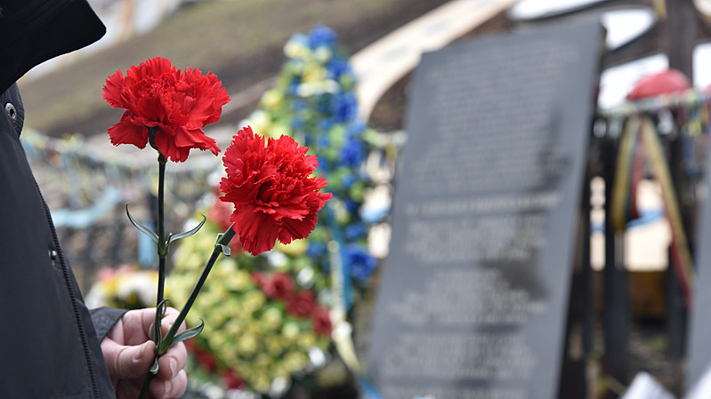На Алеї Героїв Небесної сотні зібралися десятки людей: вони приносили квіти та лампадки до рукотворного меморіалу на Алеї. Пам'ять загиблих вшанували молебнем, який провели в каплиці.