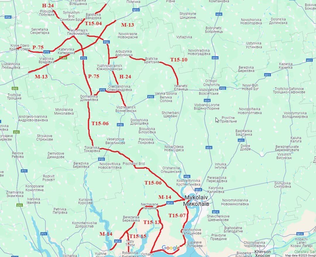 - Р-75 закрито рух від смт Криве Озеро до Первомайска та від Первомайска до смт Доманівка і смт Олександрівка;