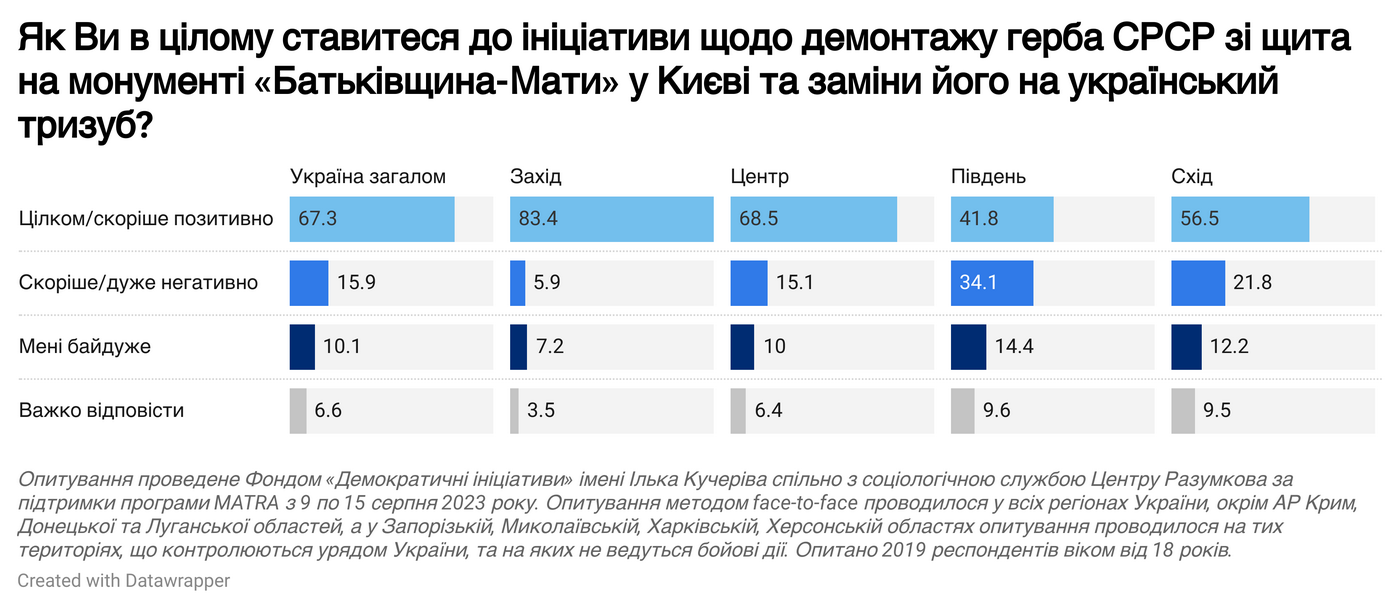 Українці схвально ставляться до ідеї заміни герба СРСР на тризуб на щиті монумента «Батьківщина-Мати» у Києві, але більшість вважають, що зробити це можна було б пізніше, а зараз кошти переспрямувати на воєнні цілі. Такі дані соціологічного опитування оприлюднив Фонд «Демократичні ініціативи» імені Ілька Кучеріва в рамках свого дослідження напередодні Дня Незалежності.