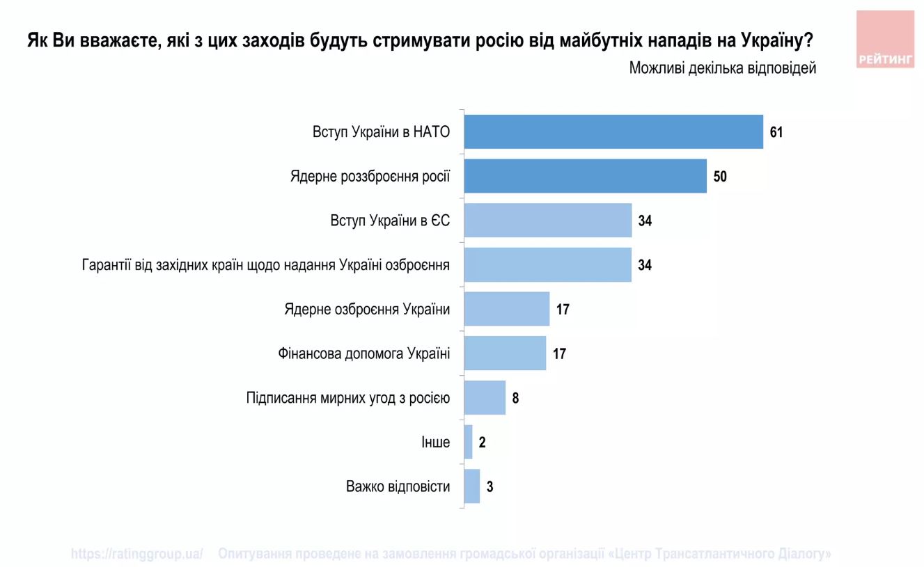 Що стосується способів стримування майбутніх нападів на Україну, зокрема росії, то найчастіше респонденти називали вступ нашої держави до НАТО та ядерне роззброєння рф. Вступ України в ЄС та гарантії від західних партнерів щодо надання озброєння нашій державі як методи стримування підтримують по 34% опитаних.