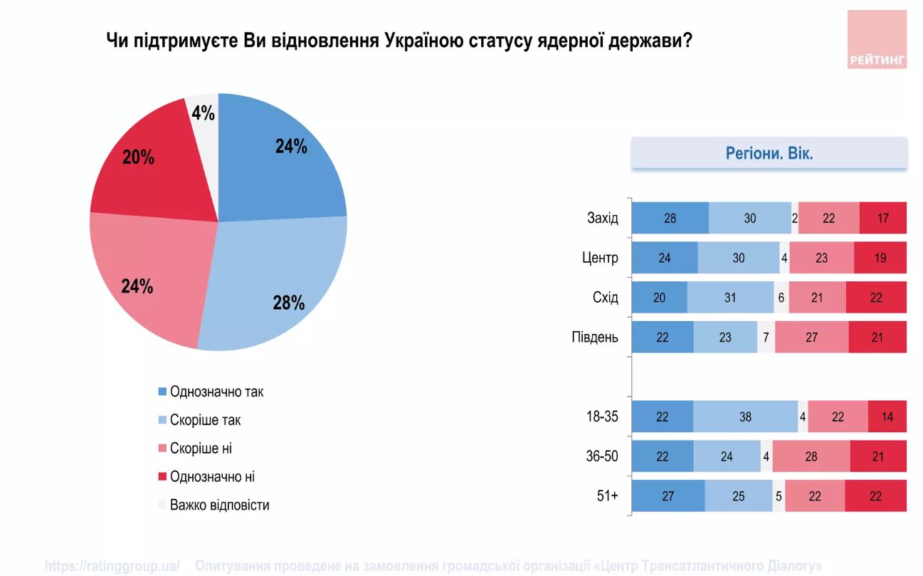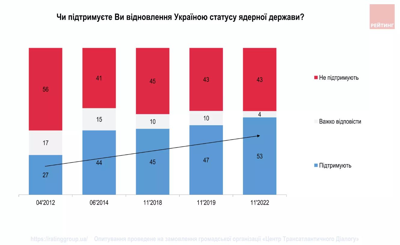 В Україні у порівнянні з 2019 роком зросло число тих, хто підтримує відновлення Україною ядерного статусу. Так, три роки тому відновлення такого статусу підтримували 47% українців, цього року – 53%, свідчать результати опитування Соціологічної групи «Рейтинг».