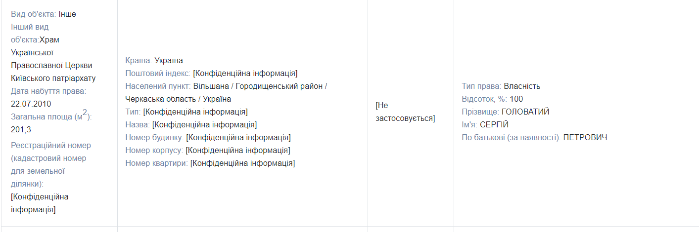 Так, згідно з його свіжою декларацією за 2020 рік Головатий з 22 липня 2010 року володіє храмом Української православної церкви Київського патріархату в селищі Вільшана (Черкаська область) площею в 201 кв. м.