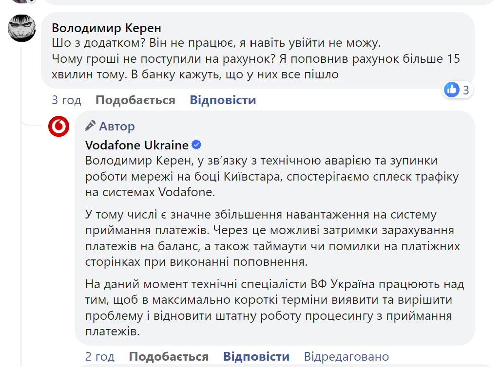 «У зв’язку з технічною аварією та зупинки роботи мережі на боці «Київстару», спостерігаємо сплеск трафіку на системах Vodafone. У тому числі є значне збільшення навантаження на систему приймання платежів. Через це можливі затримки зарахування платежів на баланс, а також таймаути чи помилки на платіжних сторінках при виконанні поповнення», – зазначили у пресслужбі у відповідь на один з коментарів у Facebook.