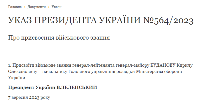 «Присвоїти військове звання генерал-лейтенанта генерал-майору Буданову Кирилу Олексійовичу – начальнику Головного управління розвідки Міністерства оборони України», - йдеться в указі президента від 7 вересня на сайті глави держави.