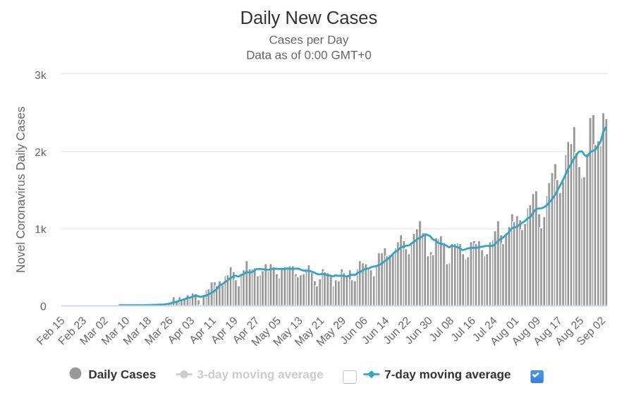 Як докази блогер наводить графік фіксування нових випадків за добу в Іспанії. На ньому видно пік першої хвилі - середина травня, фонова захворюваність на рівні близько 300-400 чоловік на день і друга хвиля - кількість випадків пішла вгору і досягла 8000 на день. Аналогічна ситуація і, наприклад, у Франції та інших європейських країнах, котрі переживають саме другу хвилю.