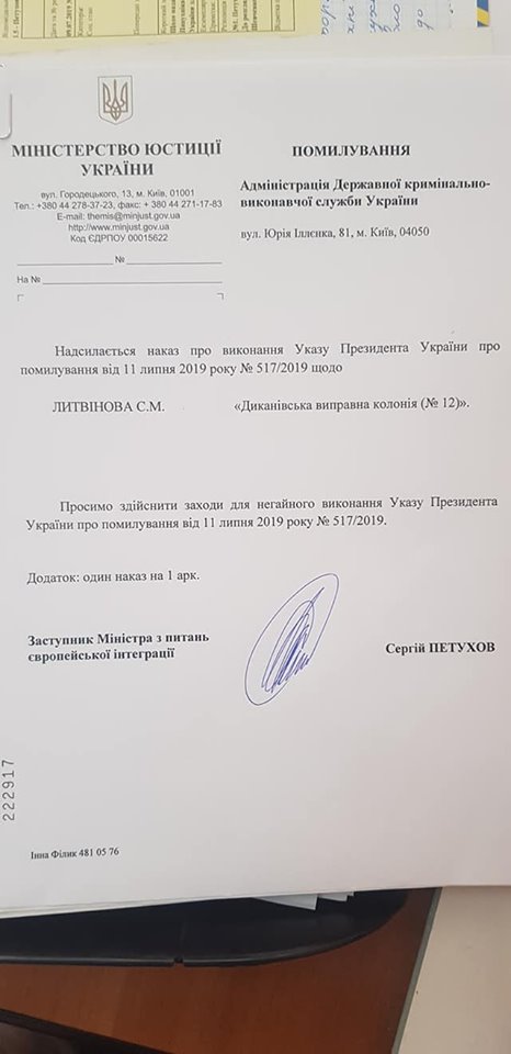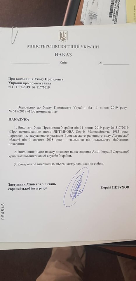 "Підписав наказ про негайне звільнення Сергія Литвінова з Диканівської виправної колонії. Фізичне звільнення відбудеться, коли документи прибудуть в колонію, це має відбутися найближчим часом", - написав Пєтухов у Facebook.