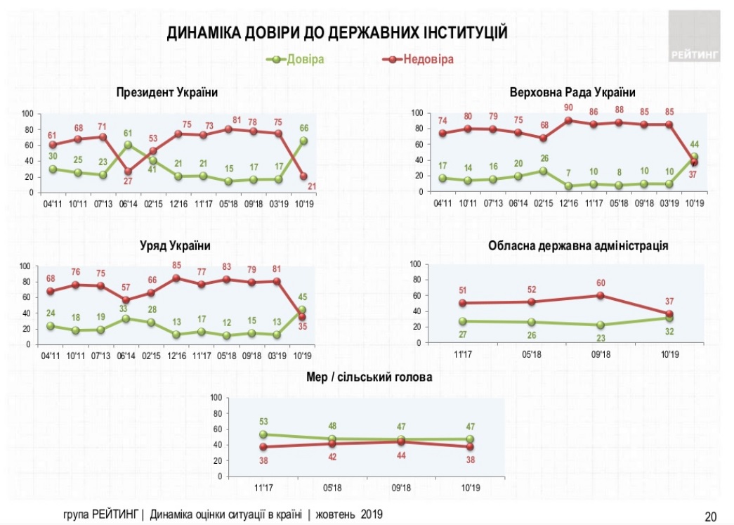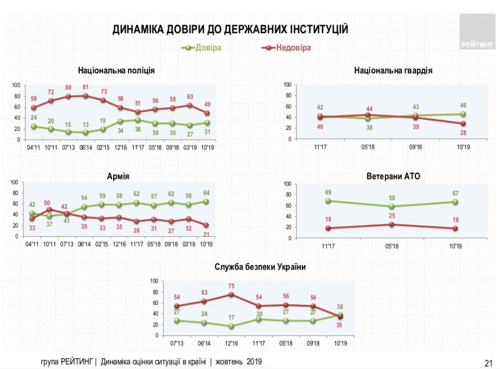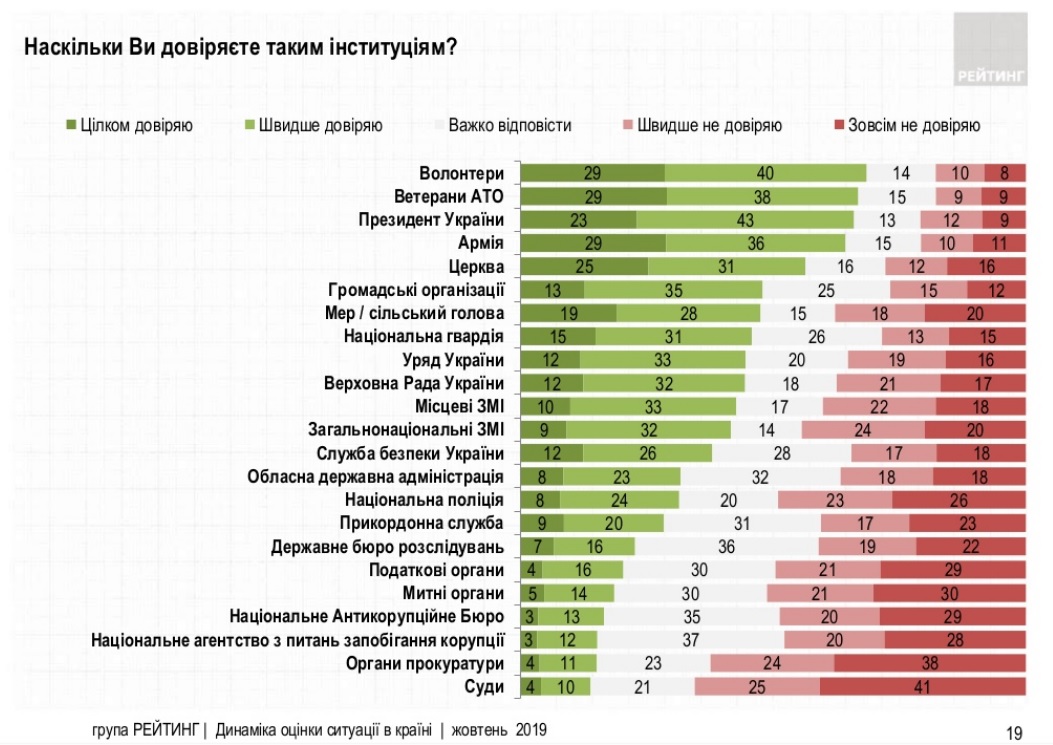 Довіра до більшості інституцій на фоні позитивних очікувань у поствиборчий період зросла. І хоча найбільше позитивних змін зафіксовано щодо центральних органів влади: президента, уряду та парламенту, однак найбільше українці довіряють волонтерам (69%) та ветеранам АТО (67%). Такі дані соціологічного опитування опублікувала група "Рейтинг".