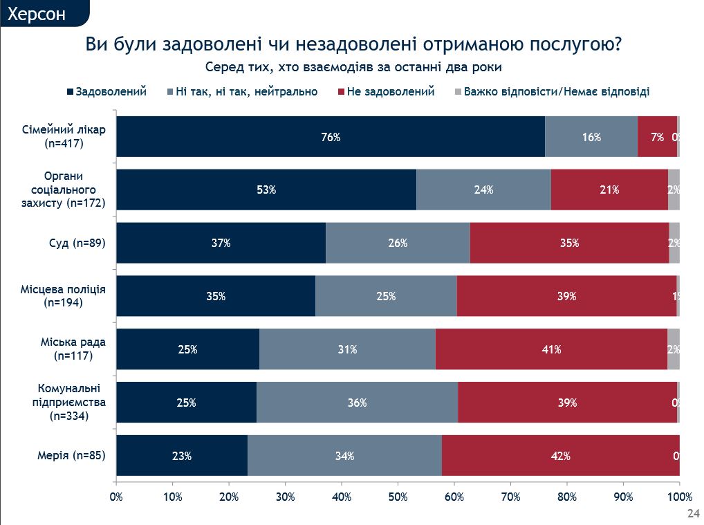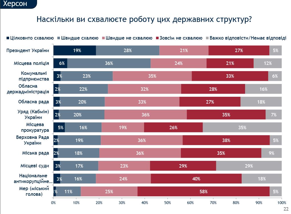 Саме стан доріг назвали жителі Херсона головною проблемою міста (40%), за нею йде складна ситуація в державних медустановах (32%) і боротьба з корупцією (30%).