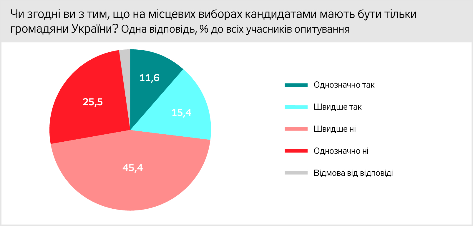 На питання "Чи згодні ви з тим, що на місцевих виборах кандидатами повинні бути тільки громадяни України?", "однозначно так" відповіли лише 11,6% респондентів. Ще 15,4% вагаються, але все ж вибрали графу "скоріше так".
