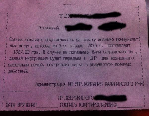 Сепаратисти погрожують донеччанам у разі неоплати передавати дані про мешканців у "Донецьку народну республіку" для "можливого заселення сімей, які втратили житло в результаті бойових дій".